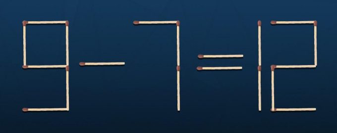 Spodaj si lahko ogledate sliko, na kateri smo z vžigalicami sestavili enakost 9-7=12. Skupaj je bilo uporabljenih 19 vžigalic.