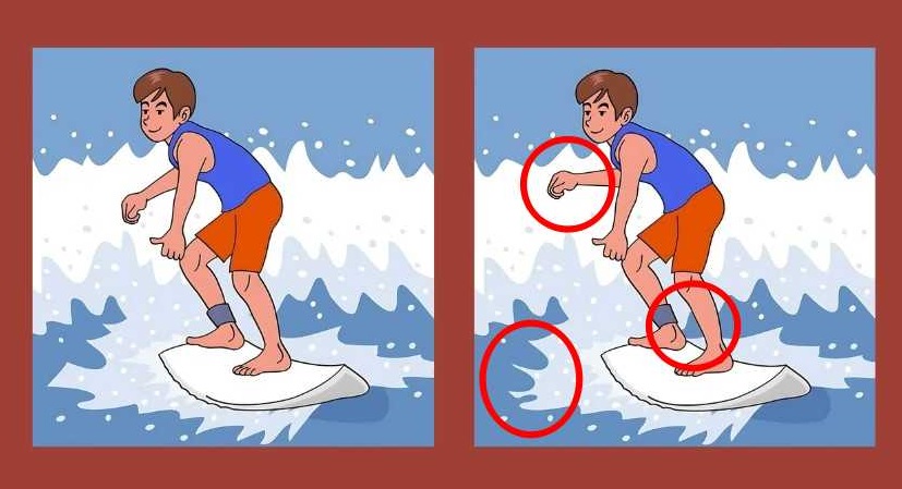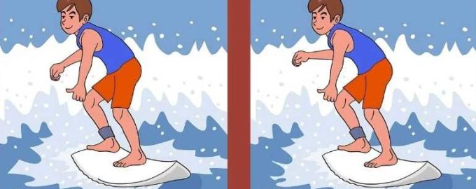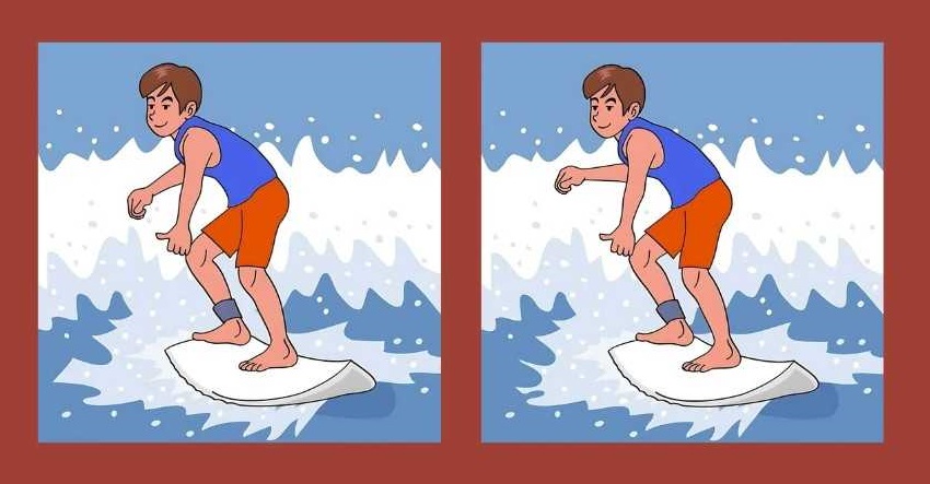 Na sliki vidimo surferja, ki na deski za deskanje osvaja valove. Na prvi pogled se morda zdi, da sta fanta na obeh slikah enaka, a če si ju natančneje ogledaš, postane jasno, da ni tako – nekje je nekaj razlik, zaradi katerih se sliki razlikujeta.