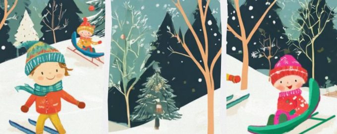 Pred vami je skupina veselih otrok, ki v gozdu uživajo v snegu in pravem zimskem vremenu. Najmlajši se sankajo, njihovi starejši prijatelji pa smučajo.