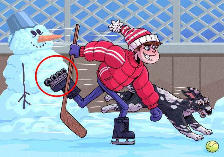 Na sliki vidimo dečka, ki drsal po ledu, poleg dečka pa teče pes. Na prvi pogled se morda zdi, da na sliki ni nobene napake, vendar v resnici ni tako. Če si jo ogledate od blizu, boste ugotovili, da so nekatere stvari napačno narisane.