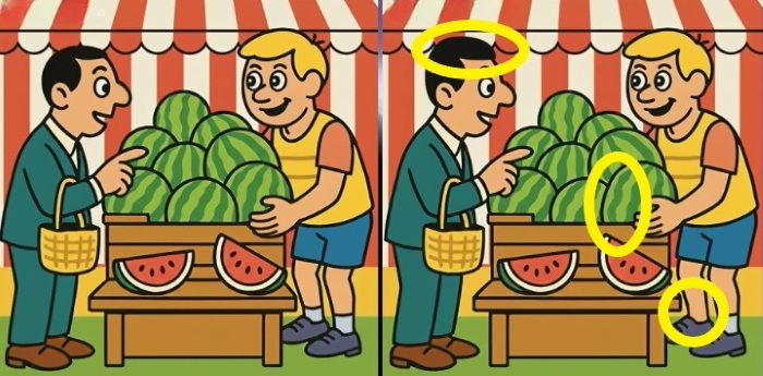 Ste pripravljeni na izziv? Natančno si oglejte dve sliki moškega, ki kupuje lubenico. Na prvi pogled sta sliki morda videti enaki, vendar so med njima tri majhne razlike. Ali mislite, da jih lahko vse najdete v 27 sekundah? Poskusite in preverite svojo ostrino vida!